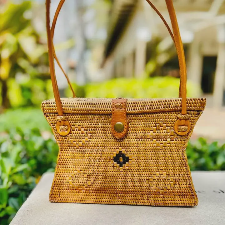 These beautiful handwoven Ata handbags are handcrafted by Balinese women working from their homes in Tenganan Village, Eastern Bali. After the purses and bags are woven, they are dried under the sun and then hung over a fire for several days. The smoke and heat from the fire give them their golden color and cure them, making them hard and durable, ensuring they will last a lifetime.
