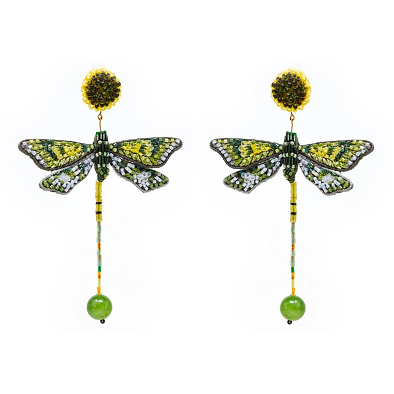 These exquisitely crafted beaded and embroidered Green Dragonfly Earrings measure 3.3" long x 2.5" wide (8.5 cm l x 6.5 cm w) and come packaged in a handsome embossed jewelry box with informative notes and care instructions.