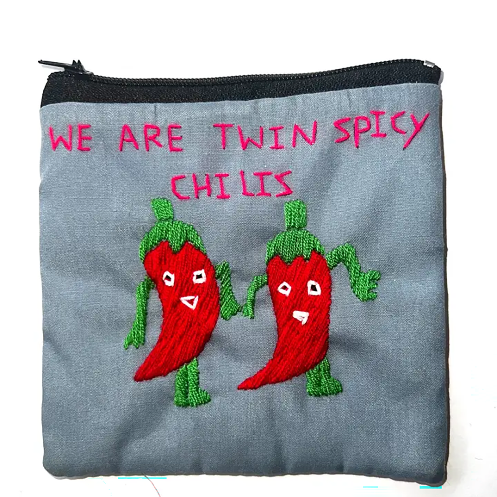 Fun, silly, ironic, colorful, and completely delightful, these coin purses are hand-embroidered in Laos by an entrepreneurial group of Hmong high school and college students who get together and embroider. The images and words are inspired by English language textbooks.