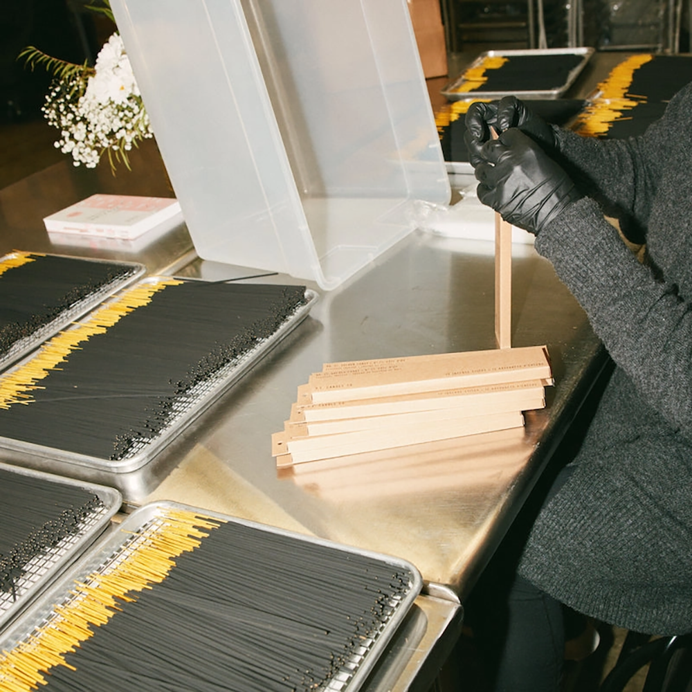 Incense quickly transforms a room: transformative smoke uplifts the space while our signature scents linger for hours even after extinguishing. Our charcoal-based Incense is hand-dipped in-house using fine fragrance oils and dipropylene glycol (DPG), a synthetic base commonly found in body care and home fragrance products.