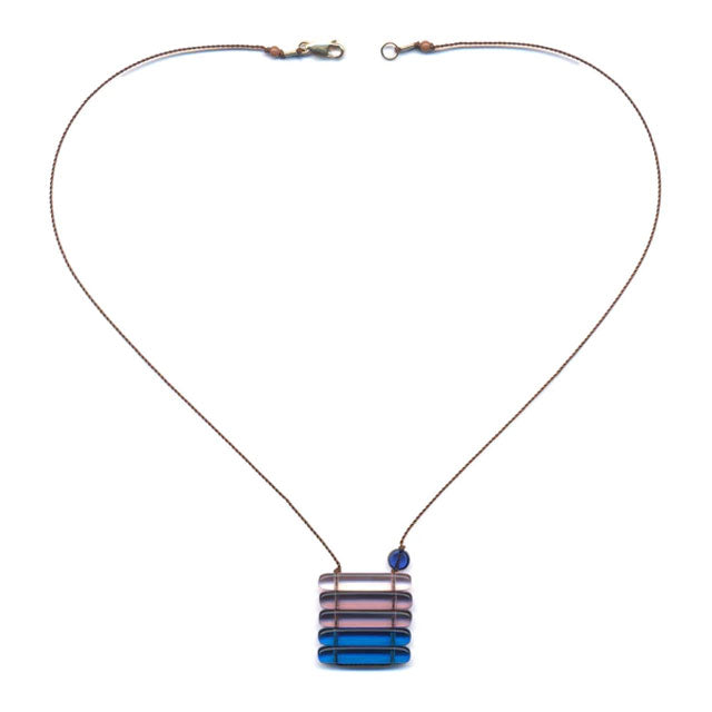 Soft-edged, horizontal pieces of transparent German vintage glass are strung with nylon cord in the Pink and Blue Empty necklace, finished with 14k gold-filled findings.